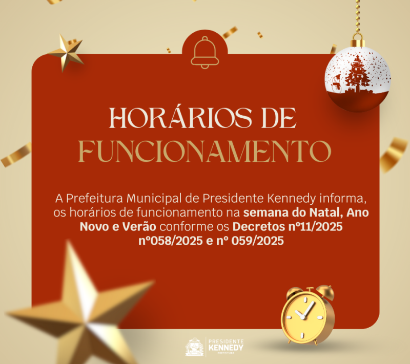 A Prefeitura informa à população os horários especiais de funcionamento dos órgãos municipais durante as festividades de fim de ano e no período de verão, conforme estabelecem os Decretos nº 11/2025, nº 59/2025 e nº 058/2025.