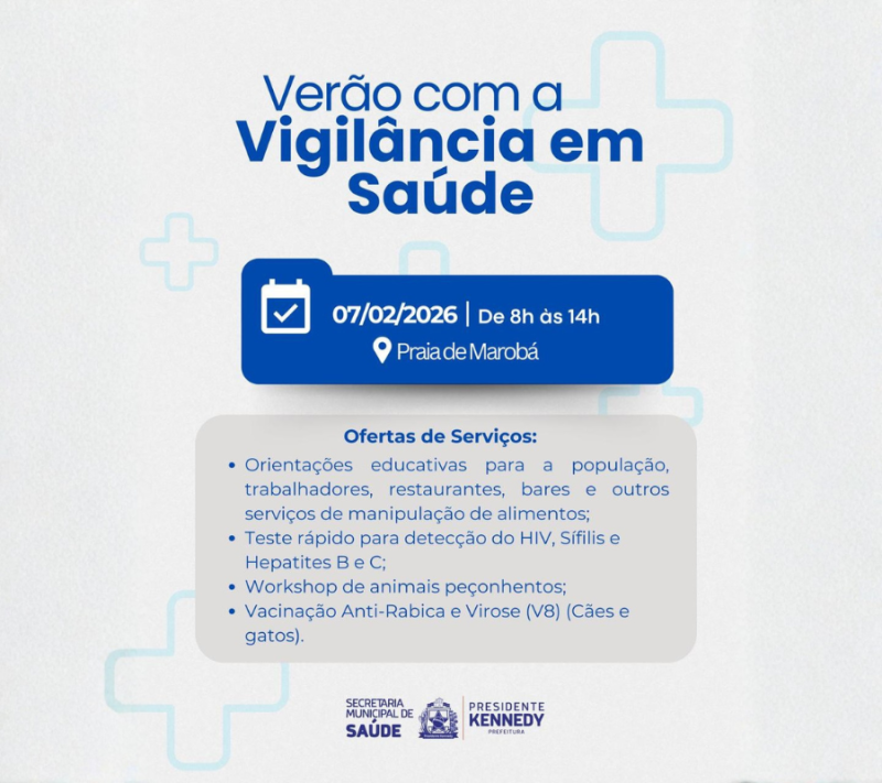 A Prefeitura de Presidente Kennedy, por meio da Secretaria Municipal de Saúde, realiza sábado, 07 de fevereiro, a ação “Verão com a Vigilância em Saúde”, na Praia de Marobá, das 8h às 14h.