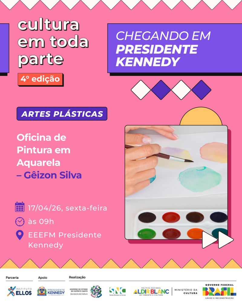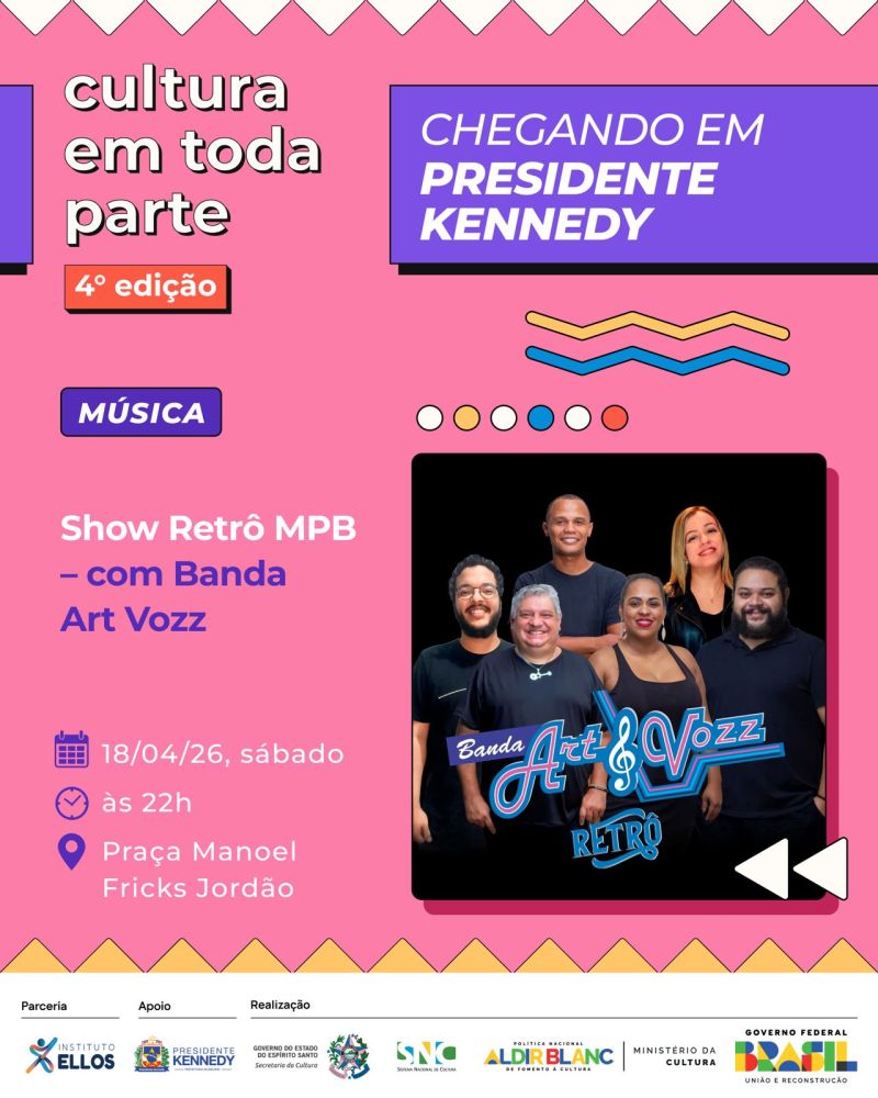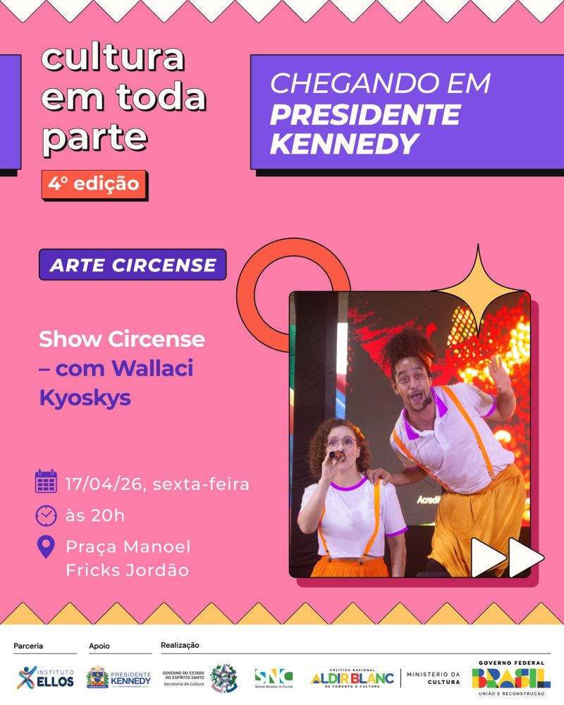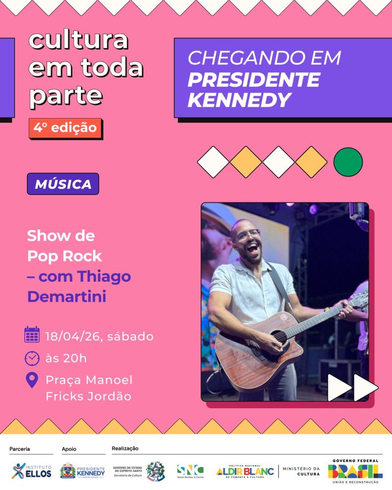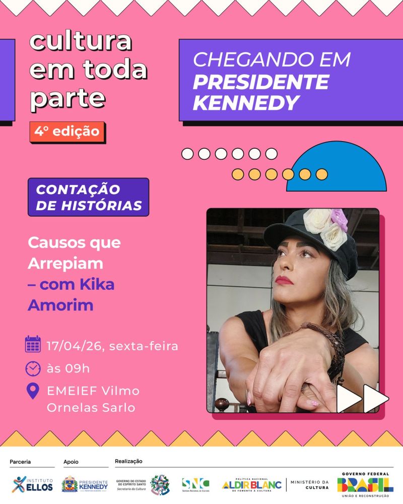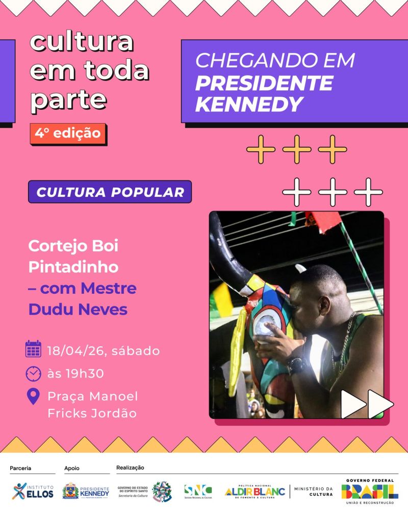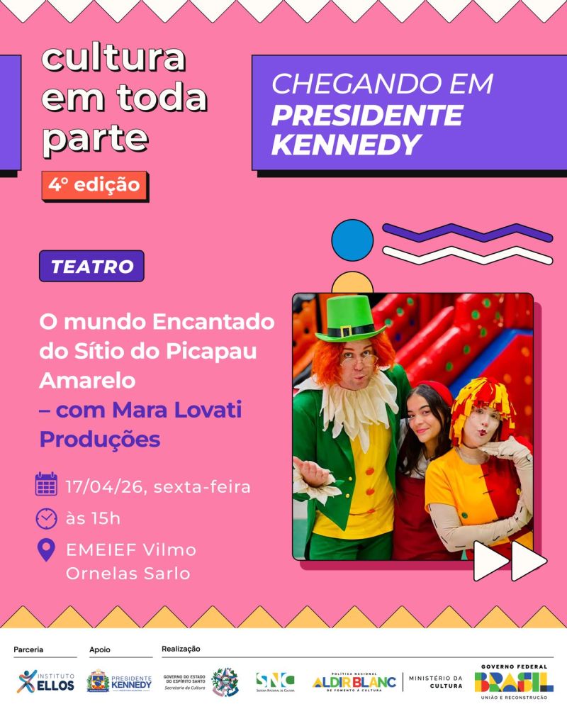 O projeto Cultura em Toda Parte – 4ª edição chega com uma programação diversa e gratuita para movimentar a cena cultural de Presidente Kennedy nos dias 17 e 18 de abril. A iniciativa leva arte, formação e entretenimento para diferentes públicos, com atividades que vão do teatro infantil e oficinas criativas a shows musicais e manifestações da cultura popular.